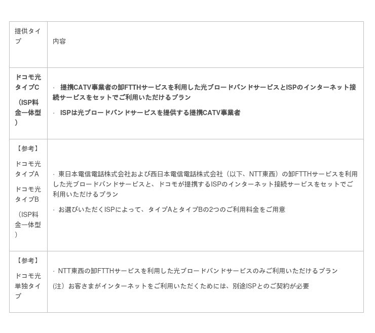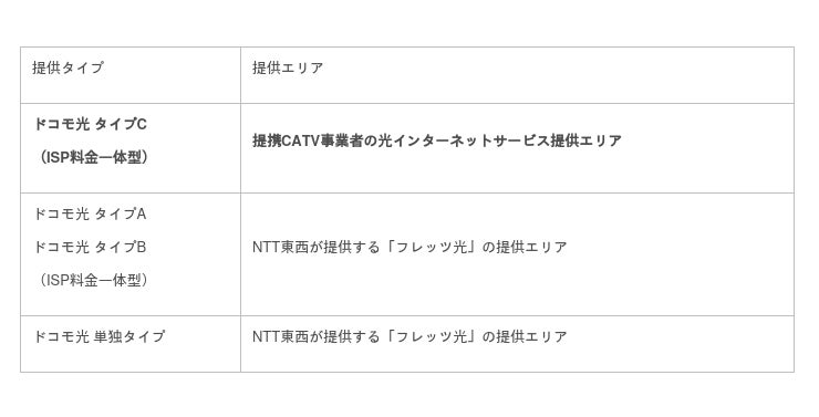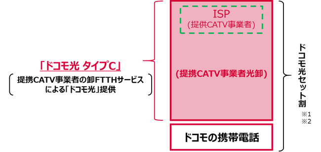 「ドコモ光 タイプC」は、提携CATV事業者の卸FTTHサービスを利用した光ブロードバンドサービスと インターネット接続サービスをセットでご利用いただけるプランで、2016年12月1日(木)から提供開始し、 提携CATV事業者を順次拡大してまいりました。現在、提携CATV事業者の光ブロードバンドサービスをご利用のお客さまは、工事不要かつご利用中の機器を変更することなく「ドコモ光 タイプC」をご利用でき、さらに「ドコモ光 セット割」をご利用いただくことで、「ドコモ光」とドコモの携帯電話をセットでお得にご利用いただけます。