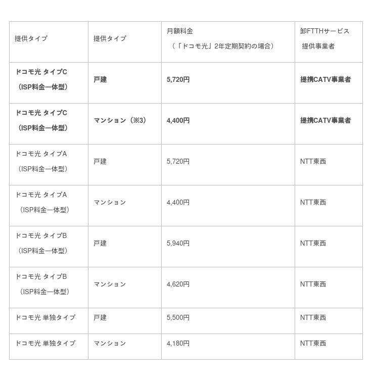 詳しくは、ドコモ光 タイプCホームページの「事業者ごとの提供プラン一覧」をご確認ください。