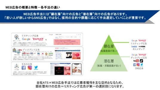 WEB広告では“顕在層”または“潜在層”向けの広告があるため、採用の目的や課題に応じた手法選定が重要です。