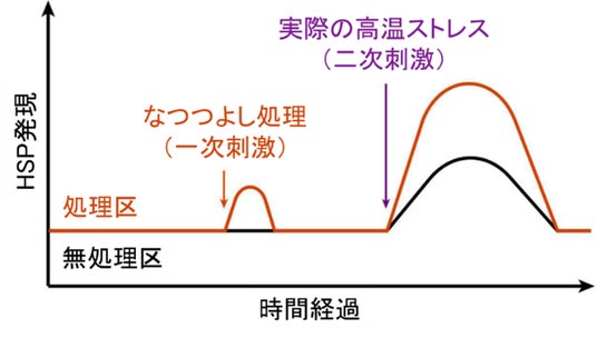 「なつつよし(R)」を植物に処理すると、植物は高温ストレスに対応するためのHSPを増産しやすい「準備状態」になります。この状態で実際に高温ストレスが発生すると、通常よりも速やかにHSPを多く生産できるようになります(プライミング効果、図2)。