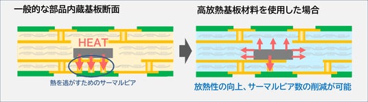 内蔵されたチップの放熱は層間を接続するために使用される導電性のビアを用いたサーマルビアによるものが主流でしたが、基板に高い熱伝導性を持たせることで放熱性が向上し、サーマルビア数の減少により回路設計の自由度が増し、部品の小型化にも貢献すると期待されています。