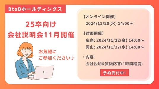 中国地方エリアを中心にWEBソリューションをはじめとしたBtoB総合サービス業を展開する株式会社BtoBホールディングス(本社:岡山県岡山市、代表取締役:仁科 慎太郎)は、2024年11月に2025年卒業予定の学生向けに会社説明会を開催いたします。