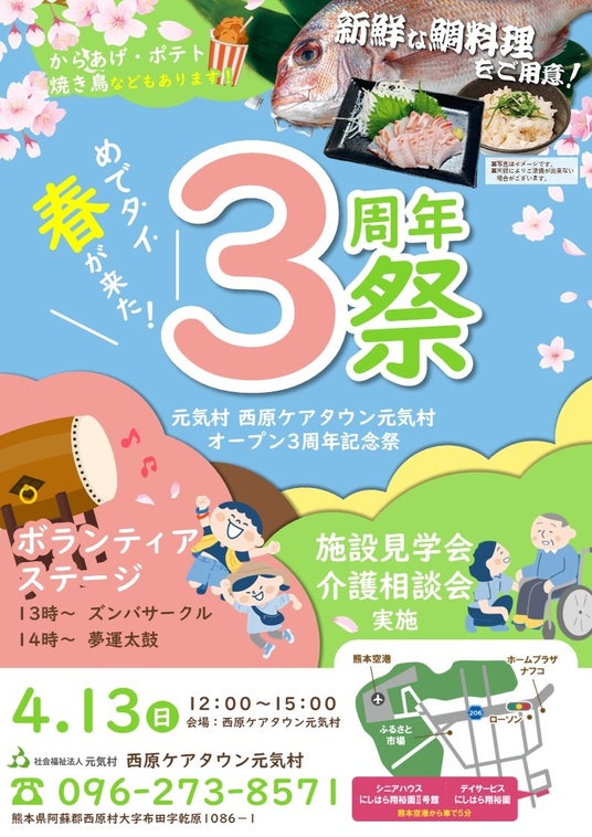 社会福祉法人元気村グループ(本社:埼玉県さいたま市、代表:神成 裕介)が運営する高齢者福祉・障害福祉サービス事業所「翔裕園」。令和4年4月1日にオープンした「西原ケアタウン元気村」が3周年を迎える事となりました。ご利用者の皆さま、地域の皆さまに支えていただいた3年間に感謝の想いを込めて、「オープン3周年記念祭」を開催させていただく事となりました。