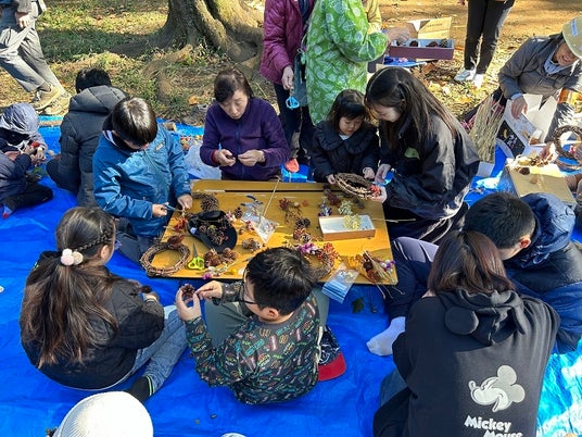 当日は、グループ社員およびその家族40名(うち子供8名)が参加し、東京都環境公社とNPO法人自然環境アカデミー、清瀬の自然を守る会の協力のもと、清瀬松山緑地保全地域(※2)において、落枝・落木整理、樹木除伐、草刈りなどを行いました。また、子供連れの家族を対象に、落枝や落ち葉を活用した「クリスマスリース作りイベント」を実施しました。