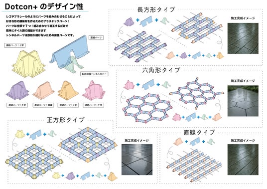 「Dotcon+(ドットコンプラス)」は、直線・十字・L字・T字・Y字・トンネルなどのパーツで構成される再生ポリプロピレン(PP)製型枠です。