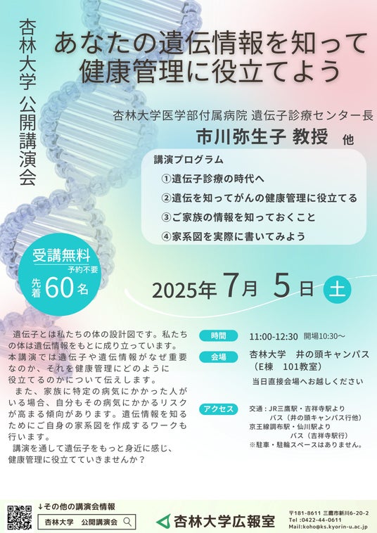 杏林大学(所在地:東京都三鷹市)は7月5日(土)、杏林大学医学部付属病院 遺伝子診療センター長 市川弥生子教授による講演会「あなたの遺伝情報を知って健康管理に役立てよう」を実施します。