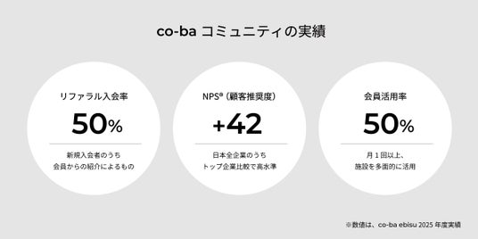 その成果は数字にも表れています。co-ba ebisuでは、入会者の50%がリファラル(会員紹介)経由であり、NPS(R)(顧客推奨度)は+42を記録。日本の全業界トップ企業と比較しても高水準を維持しています。