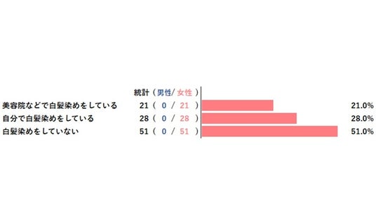 ──────────────────────────────そのほかにも、白髪に関して以下のような意見がありました。・白髪ぼかし施術を2年前からやっている。ブリーチして黒髪用のファッションカラー染め(埼玉県女性・53)・老けて見えるので、なるべく染めたいと思います。以前は、自分で染めていましたが美容室で染めるようになりました。楽だし綺麗なので(北海道女性・55)・白髪にすると かなりのファッションセンスがないとただのおばあさんになってしまう。それは悲しいので染めている(岡山県女性・67)・肌が弱く化粧品アレルギーがあるので多分合う白髪染めがないのではないか、と言う事と今現在はそれほど白髪は目立たないので(神奈川県女性・58)・気になるので染めるが時間もお金もかかるのでできれば何もしたくない(東京都女性・57)・現在白髪は数本程度なので染めてはいません。この先、もっと増えてきた時、髪や頭皮の事を考えると染めたくない為(三重県女性・49)・髪が痛む、きりがない。極力染めないようにしているが、出かけるときなどは気になるのでそういう時は前もって自分で染める(東京都女性・53)──────────────────────────────