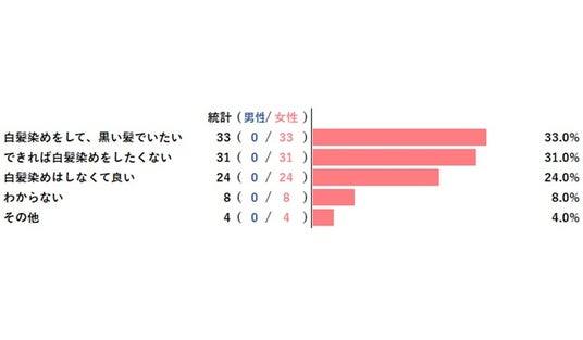 次に 「白髪染めに関して、次の内あてはまるものを選んでください」とアンケート調査した結果、1位は『白髪染めをして、黒い髪でいたい』でした。