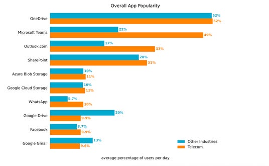 - Microsoft OneDriveはデータをアップロードするアプリとして最も使用率が高く、通信業界のユーザーの30%がOneDriveへのデータのアップロードを毎日行っています。これは業界全体の平均との比較において50%多い数字です。同様にMicrosoft OneDriveは通信業界で最も多くダウンロードに使用されるアプリでもあり、35%のユーザーがOneDriveからデータをダウンロードしています。