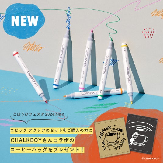 会場でコピックアクレア 6色セットをご購入いただいた方全員に、イラストレーター「CHALKBOY」さんの描き下ろしイラストがデザインされたコーヒーバッグをプレゼントいたします。
