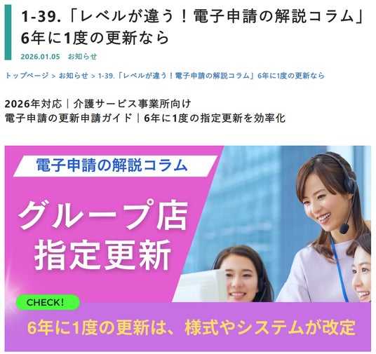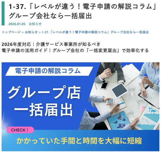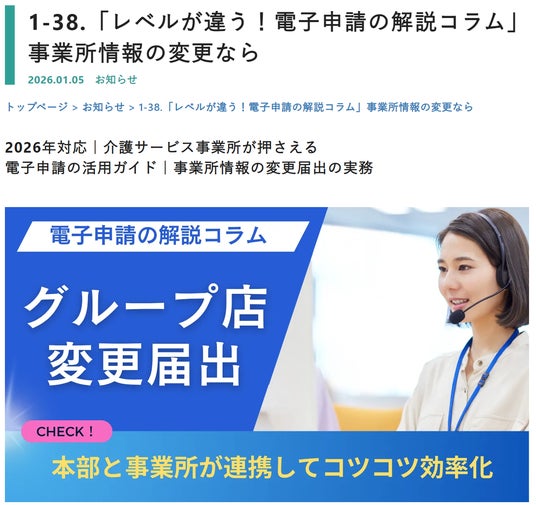 介護業界の電子化や公表化を支援する公表システムサポート株式会社(東京都新宿区)では、2026年1月より、介護サービス事業所の電子申請・届出手続きを効率化するコンテンツとして、「レベルが違う!電子申請の解説コラム」シリーズを配信します。