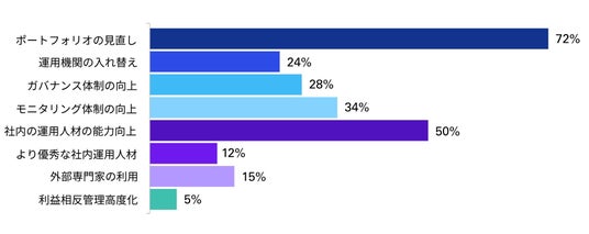 DB年金運用の課題として「ポートフォリオの見直し」は普遍的な課題ですが、その次に多いのが「社内の運用人材の能力向上」、次いで「モニタリング体制の向上」となっています(図表2)。