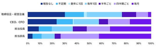 前回調査から大きな変化はありません。モニタリング体制に関しては、一部の企業では毎月あるいは四半期ごとの頻度でマネジメント層への報告が行われる一方、定期的な報告がない企業も一定数存在しており、企業間のばらつきがみられます(図表6)。