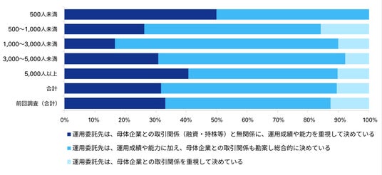 純粋に運用能力だけで委託先を決定している企業は全体の30%程度にとどまっており、多くの企業では金融機関との取引関係が考慮されています(図表4)。この傾向は前回と同様であり、コーポレートガバナンス・コードの「企業年金の受益者と会社との間に生じ得る利益相反が適切に管理されるようにすべきである」という考えがあまり浸透していないと言えます。