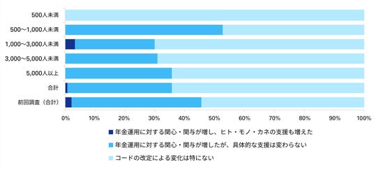 コーポレートガバナンス・コードにおいてアセットオーナー機能の発揮に関する原則が盛り込まれ、企業年金を実施する上場企業は、運用に当たる適切な資質を持った人材の計画的な登用・配置などの人事面や運営面における取組みを行うことが求められました。しかしながら、過半数の企業ではマネジメントの姿勢の変化はなく、具体的な支援が増えたと回答する企業はほとんどありませんでした(図3)。「資産運用立国実現プラン」が求めるアセットオーナー機能の発揮をより推進するには、マネジメント層のより一層の啓発が必要と考えられます。