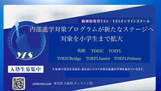 個別指導塾YES/YESオンラインスクールでは、ご好評いただいている中高一貫校内部進学プログラムの対象を小学生にも広げ、英検(R)︎各級の他、TOEICBridge(R)︎ ・TOEFLJunior(R)︎ ・TOEFLPrimary(R)︎対策を強化致します。 詳細は以下のリリース文をご参照ください。