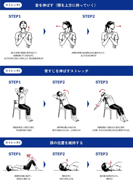 吉田先生によると、姿勢が逆進化している可能性がある人の特徴として、頭が前に出て胸が開けなくなり、背中が丸まっている人が多いということを挙げています。これらを解消するための以下のような簡単に実践できる3つのストレッチを紹介しています。詳細は、特設サイトをご覧ください。