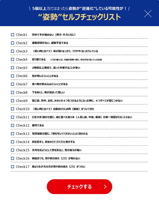 理学療法士・医学博士 吉田一也先生の監修のもと、姿勢の状態をセルフチェックするチェックリストを作成しました。5項目以上当てはまる方は、姿勢が逆進化している可能性があります。