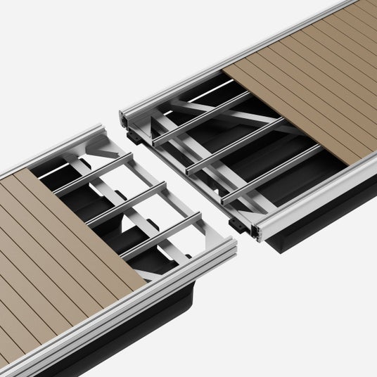 フレームはリサイクル可能なアルミ材を採用し、標準仕様のデッキ材には、エコマーク認定品を採用しています。強靭な樹脂製フロートは、発泡スチロールのように浮遊ごみを発生させません。