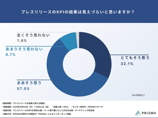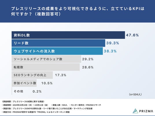 今回、株式会社PRIZMA(https://www.prizma-link.com/press)は、プレスリリースのKPIを資料DL数・リード数で置いたことがある広報・マーケティング担当者504名を対象に、「プレスリリースの成果に関する調査」を実施しました。