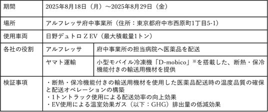 アルフレッサ株式会社(以下:アルフレッサ)とヤマト運輸株式会社(以下:ヤマト運輸)は、近年の異常気象による猛暑下でも医薬品を安全かつ確実に配送するため、「小型EVトラック」と「断熱・保冷機能付きの輸送用機材」を活用した医薬品配送の実証実験を開始します。両社は、環境性と経済性を両立する、持続可能な医薬品配送の構築に向けて取り組みます。