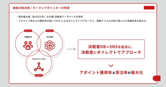 キーマンアポインターは、良質なアポイント(ニーズが顕在的な企業における、CxO・ターゲット事業部長・責任者との商談)を量産するサービスです。
