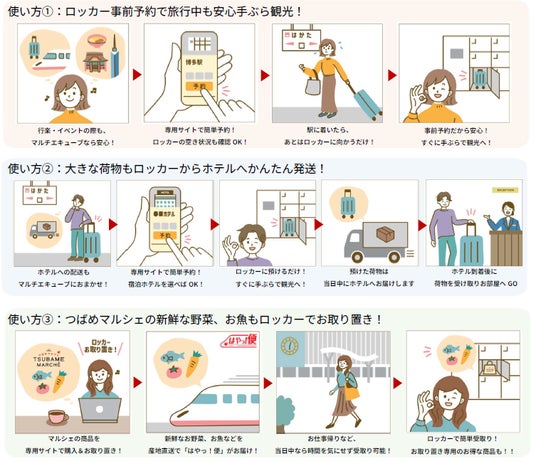 通常の預入ロッカーとしてのご利用はもちろん、一部BOXは冷蔵機能も搭載。食品なども安心して預入いただけます。ロッカーの事前予約サービスは、ご旅行やご出張など多くのお荷物があるお客さまや、イベント開催時など確実に荷物をお預けになりたい場面での活用が期待されます。