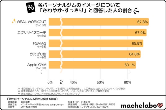 上位5ブランドの結果を見ると、『REAL WORKOUT』が67.8%で最も高い数値となりました。次いで『エクササイズコーチ』が67.0%、『REVIAS(レヴィアス)』が65.8%、『かたぎり塾』が64.8%、『Apple GYM』が63.1%と続きます。
