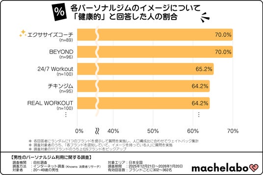 上位5ブランドの結果を見ると、『エクササイズコーチ』と『BEYOND』が70.0%で最も高い数値となりました。次いで『24/7 Workout(トゥウェンティーフォーセブンワークアウト)』が65.2%、『チキンジム』と『REAL WORKOUT』が64.2%と続きます。