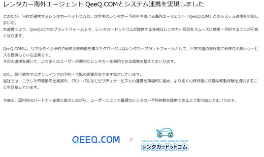 Online Travelのユーザーは、QEEQを通じて世界中の高品質なレンタカーを簡単に予約でき、豊富な車種とお得な料金を利用できます。また、QEEQはOnline Travelの地域での影響力を活かし、日本市場でのブランド認知度向上とユーザー基盤の拡大を図ります。