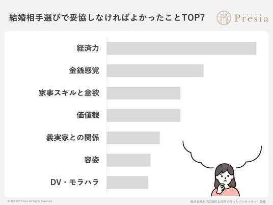 7割が「夫選びに後悔あり」。妥協してはいけないのは「経済力」、してもいいのは「容姿」。結婚相談所Presiaが調査レポートを公開