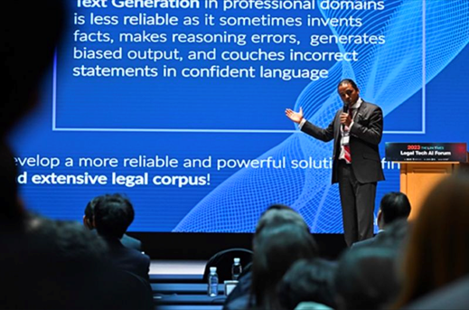 「生成AIとリーガルオペレーションズ」をテーマとした本イベントでは、韓国国内代表ローファーム及びリーガルテック企業関係者など約200名が出席いたしました。現在、法曹分野におけるAIの変化と導入のスピードは目覚ましく、特にジェネレーティブAIがもたらす法曹界の大きな改革が、業界を再建築しつつある状況にあります。そのような背景を受け、AIの展望やAI技術の進化が与える影響や、法曹界がAIを活用していくうえでのリーガルオペレーションズ先進企業の可能性を探る機会となりました。