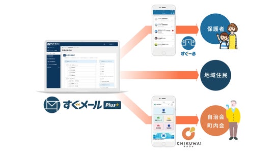 住民向け一斉情報配信システム「すぐメールPlus+」から「CHIKUWA!」などに連携・配信しているイメージ。