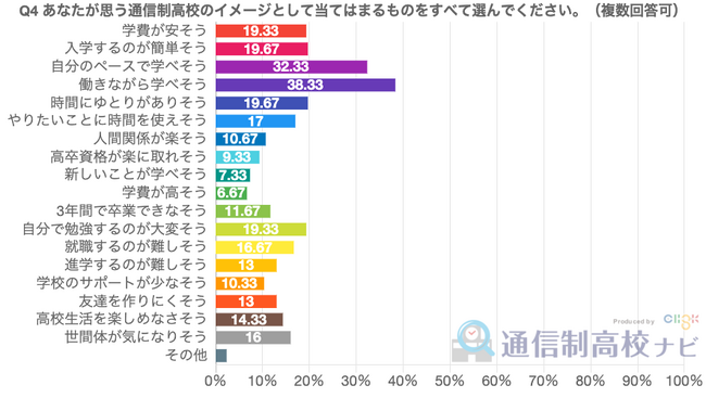 Q4「あなたが思う通信制高校のイメージ」については、最も回答数が多かったのが「働きながら学べそう」(38.33%)でした。