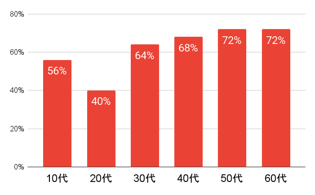 年代別では、「とても良い」「良い」の合計割合が最も高かったのは60代以上で56%、次いで10代が54%、20代が50%となっていました。