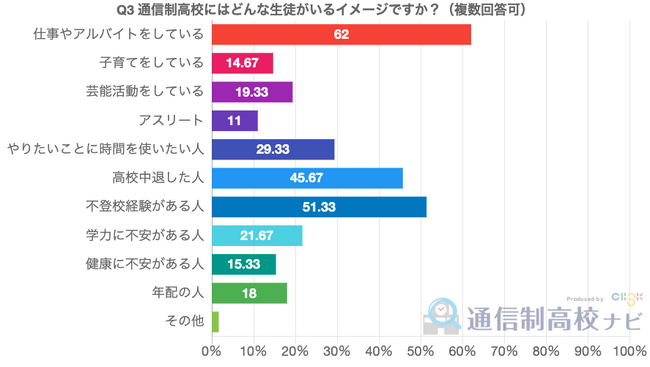 「通信制高校にはどんな生徒がいるイメージか」を尋ねたQ3では、最も回答数が多かったのが「仕事やアルバイトをしている」(62%)でした。こちらは50代、60代でいずれも72%が選択しており、10代の56%、20代の40%と比較すると高い回答率になっています。