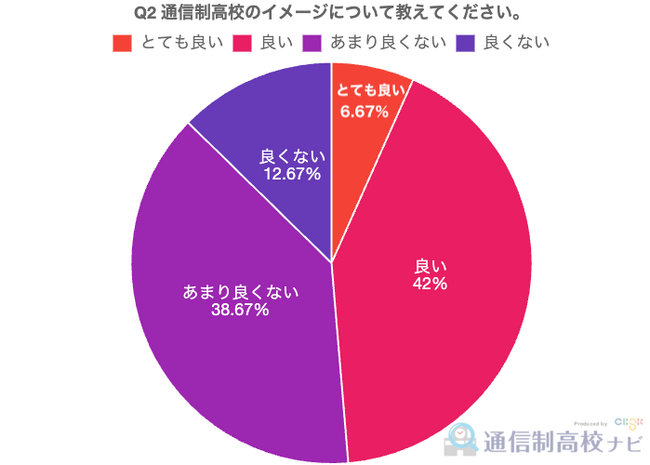 次に「Q2 通信制高校のイメージについて」尋ねたところ、「とても良い」「良い」と答えた人が全体の48.67%となり、およそ半数に上っています。この割合は2022年度では45%、2021年度では43.67%となっており、少しずつイメージが良くなってきていることが伺えます。