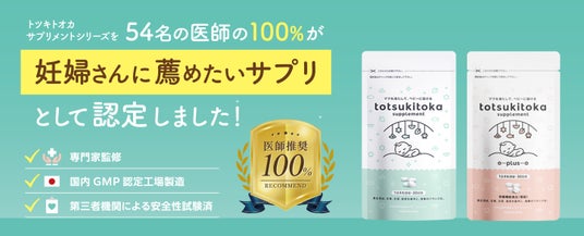 トツキトオカサプリメントは、妊活~授乳期の中で、時期にあわせて栄養を摂取できるように2つのサプリメントを展開しており、シリーズで54名の医師全員が妊婦さんに薦めたいサプリとして認定し、葉酸サプリシリーズとして「医師推奨マーク」を取得しています。