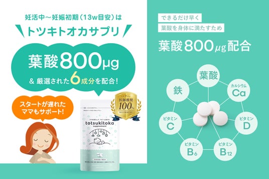 トツキトオカサプリは、つわりなどで食事からの葉酸摂取が足りないママ、妊娠に気づいてから葉酸サプリをスタートするママでも「できるだけ早く葉酸を身体に満たせる」ように800㎍の葉酸を配合しています。