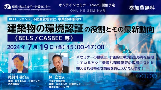 建築物の省エネ計算事業を手掛ける、環境・省エネルギー計算センター(本社:東京都豊島区、代表取締役:尾熨斗啓介、運営会社:株式会社HorizonXX)は、2024年7月19日(金)、REITや不動産ファンド、不動産管理会社、事業会社などを対象に、『建築物の環境認証(BELS、CASBEE等)の役割とその最新動向』をテーマとしたオンラインセミナーを開催いたします。