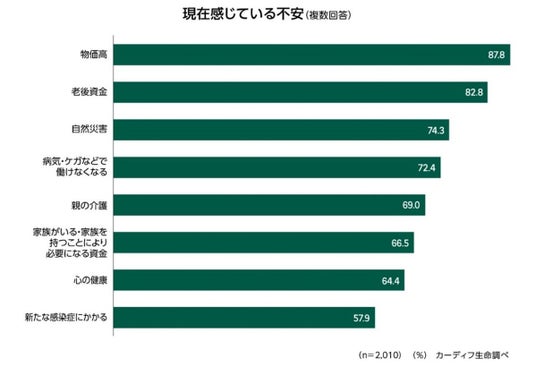 - 現在感じている生活不安は「物価高」(88%)が3年連続で1位となり、昨年から5pt上昇(83%→88%)。次いで2位が「老後の資金」(83%)となり、経済的な不安が高まっていることがうかがえる(図表1-1)。