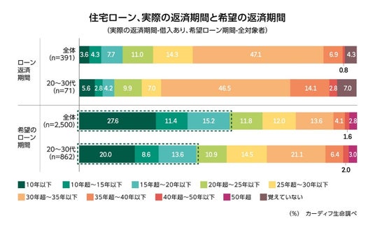 - 住宅ローンの期間、理想と現実にギャップ。理想は「20年以内」が54%、現実は「30年以上」が55%