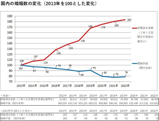結婚相談所利用者の成婚数と、国内婚姻数の増減の比較