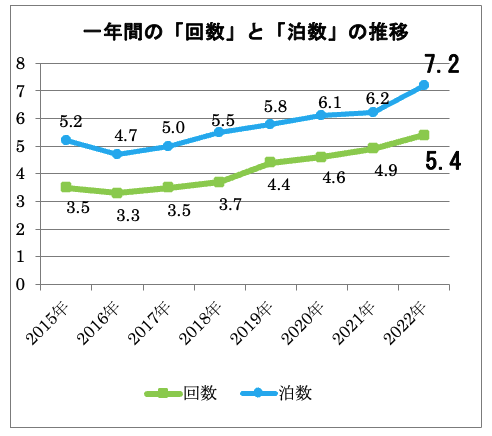 2022年のキャンプの特徴は回数と泊数の多さで、一年間の平均キャンプ泊数は初めて7泊を超えた7.2泊に、また回数も5.4回と初めて5回を超えた。