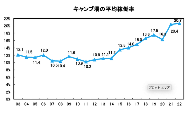 こうした利用者が度々キャンプ場を訪れることでキャンプ場の平均稼働率は21年の20.4%をさらに更新し20.7%となっている。