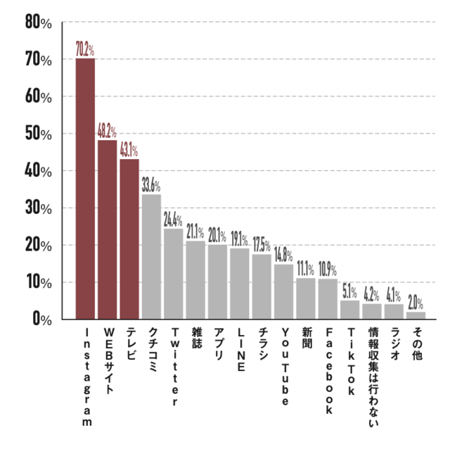 「Instagram」70.2%、「WEBサイト」 48.2%、「テレビ」43.1%となりました。 Instagramが他に差をつけた1位となり、その浸透度の高さが分かります。また、約半数がWEBサイトを活用しており、Instagram広告や検索エンジンのリスティング広告の効果が見込まれます。年代別では、40代以下は圧倒的にInstagram から「食」情報を集めていますが、50代以上 ではテレビが1位となっており、世代毎のマーケテイングの考慮が必要になることが分かります。