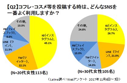 また、コフレ・コスメ等を投稿するSNSとしては、20代30代共に、「Instagramが1位」という結果となりました。