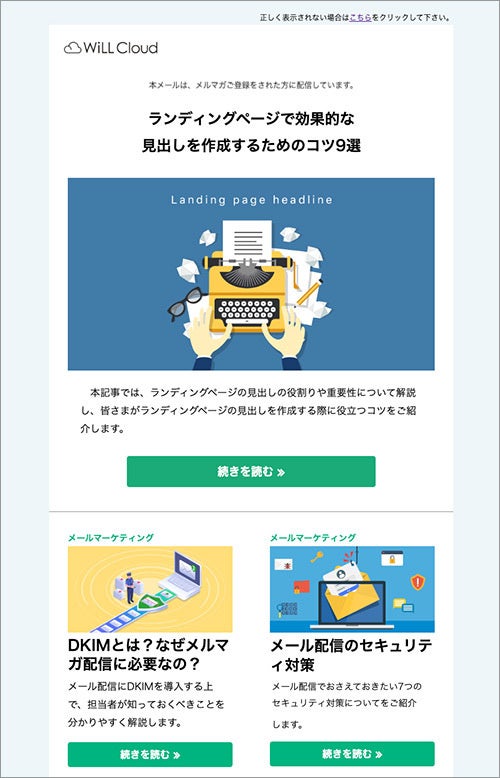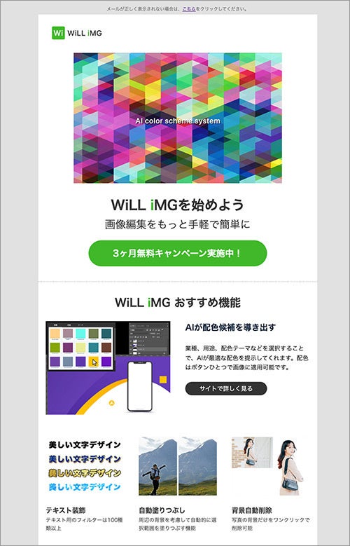 当社はメール配信システム「WiLL Mail」において、メール作成をより効率的に行える新しいHTMLメールのデザインテンプレートを4種類追加いたしました。ユーザーの皆さまは、テンプレートの中から自社の訴求内容に最適なデザインをHTMLメールエディタに取り込むことで、メール作成にかかる時間を大幅に削減し、効果的な情報発信が可能となります。