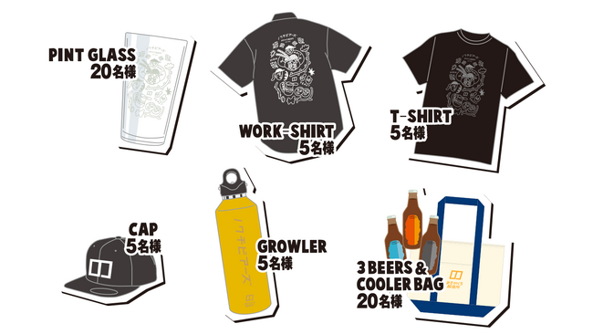 タップルームで好評販売中のグラウラーと保冷バッグのほか、これまで作ってこなかったパイントグラスやアパレルを一挙解禁。選べる景品も早い者勝ちとなりますので、ぜひご参加くださいませ!